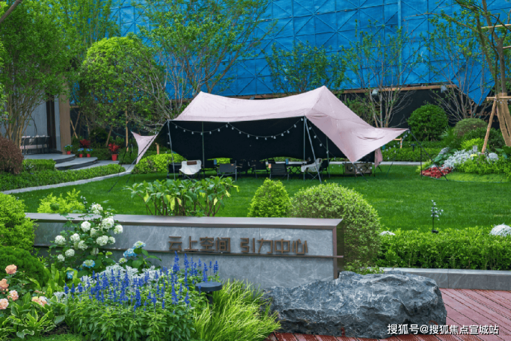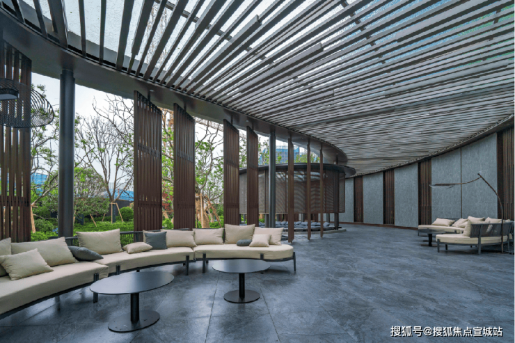 廊架下方,一处半围合的会客空间若隐若现,后期在这里或品茗、或插花、或对弈、或社交......一厅、一水、意境深远,整体的空间氛围大气且优雅。会客厅前方是近350㎡的中央阳光草坪的云上空间,为业主提供多功能户外活动场地,聚引生活的引力,绽放社区的活力。