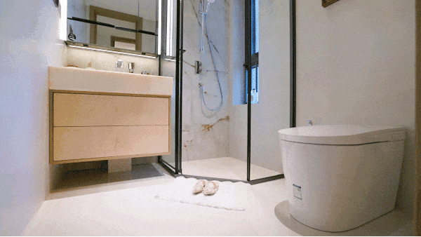 卫浴方面,唯宝智能马桶冬天有加热圈,起夜时感应夜灯自动亮,不用摸黑;主卫科勒镜柜里,10-25℃可调温的美妆冰箱,让护肤品不用凑合放客厅。