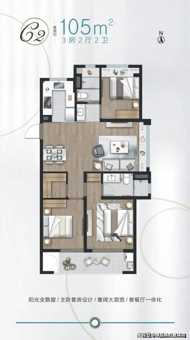 锦绣澜湾售楼处电话☎:400-882-8814(预约热线)✔✔✔建面约105㎡3房,餐客大横厅设计,与南面阔景阳台相连,采光通风良好。全卧飘窗,主卧套房设计,提升了居住舒适度。U型厨房,动线流畅。