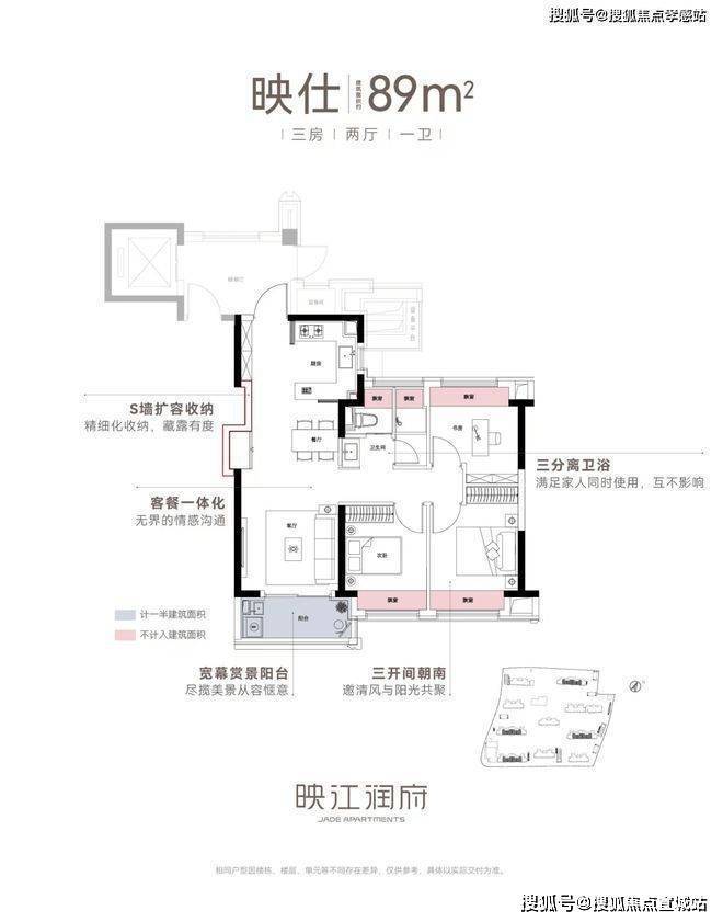 亮点一:华润映江润府售楼处电话/地址:400-838-5958✔✔【预约☎】不足90m²做三房,完美平衡舒适度,该户型很好的兼顾了功能性与总价段,让更多希望改善居住品质的人,可以实现在城区买到华润置地的品质好房,而且户型设计整体方正通透,三开间朝南,良好的采光效果,很好的关照了居住舒适度。