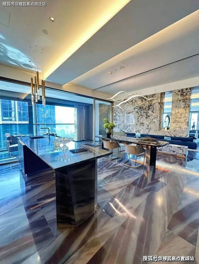 古北壹号公馆售楼处电话☎:400-882-8814(预约热线)✔✔✔往里走是开阔的客餐厨空间,一面以冷静的灰色为主,另一面则以温润的木色装饰,诠释了居室的多样性。