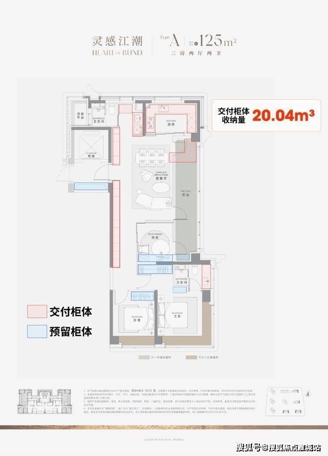 据小胖君手工统计,项目125㎡3房边套户型的整体交付柜子+预留衣柜,收纳空间可以达到约20.04m³,中间套户型也能达到约16.56m³!