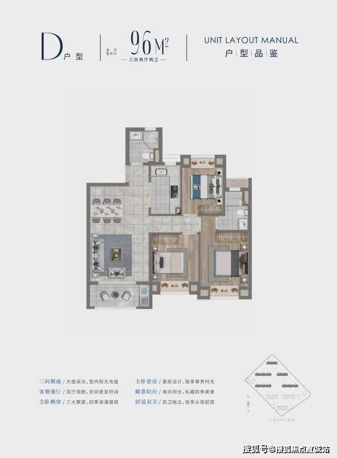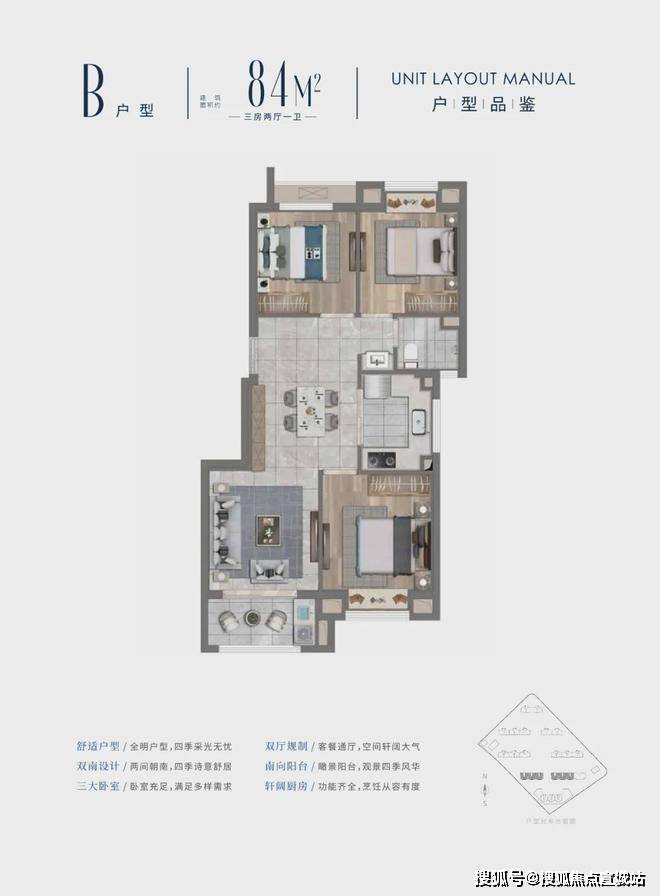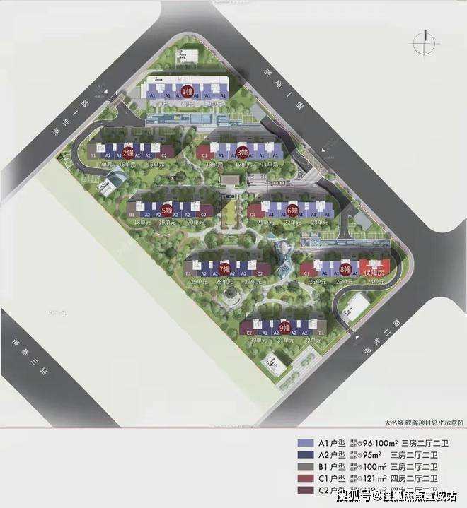 主力户型:有 84-100㎡的三房,其中 84㎡为三房两厅一卫,96㎡、100㎡为三房两厅两卫。