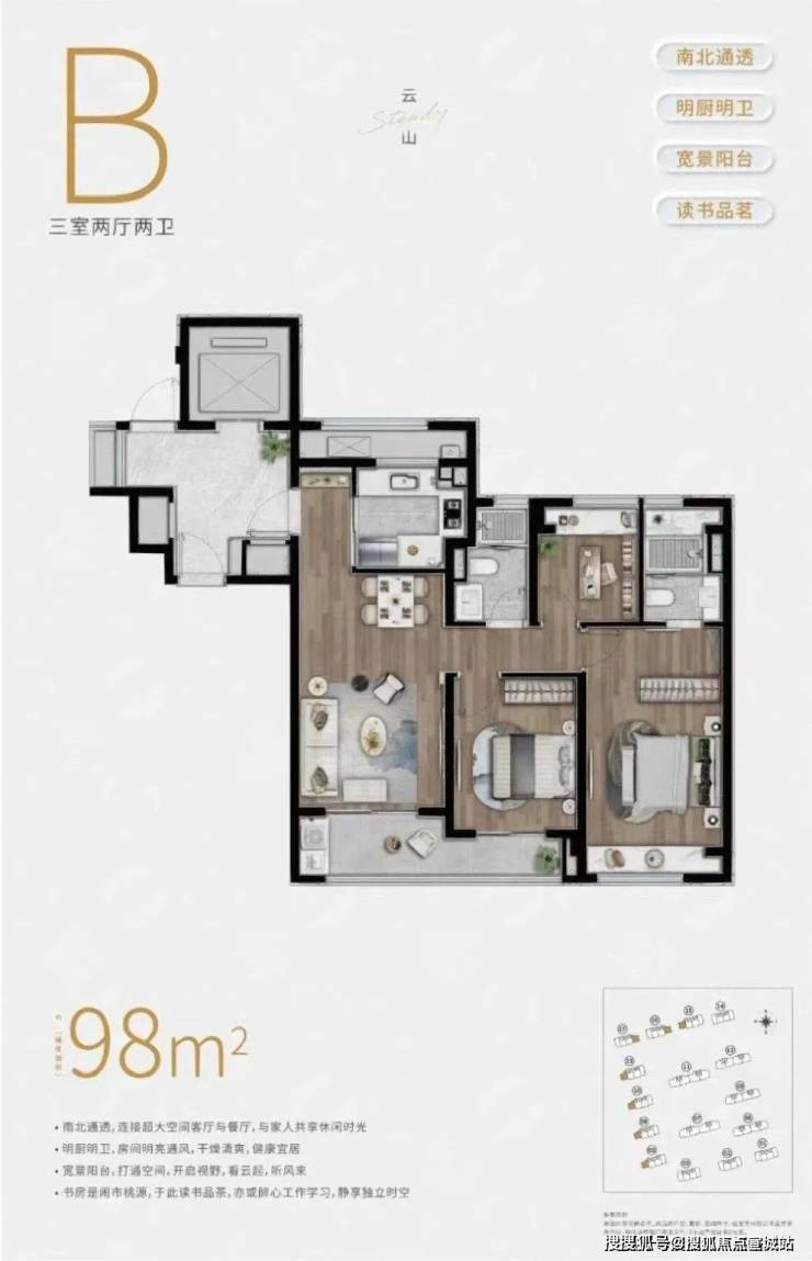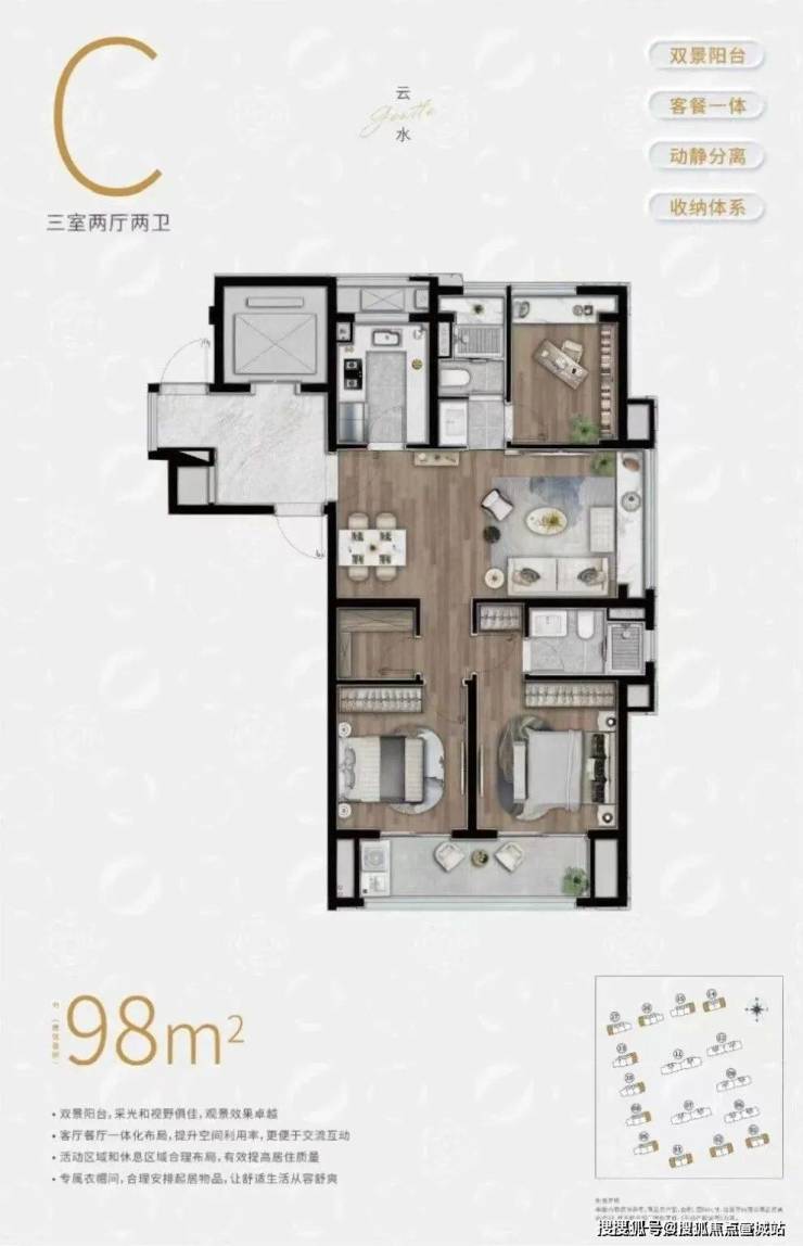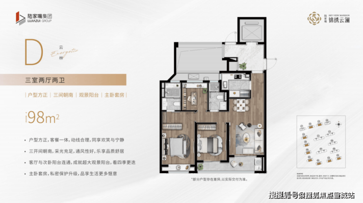 实用性方面,户型3房3卫、 南向双套房的设计,可以保证每个家庭成员都能拥有更具私密性的居住空间。