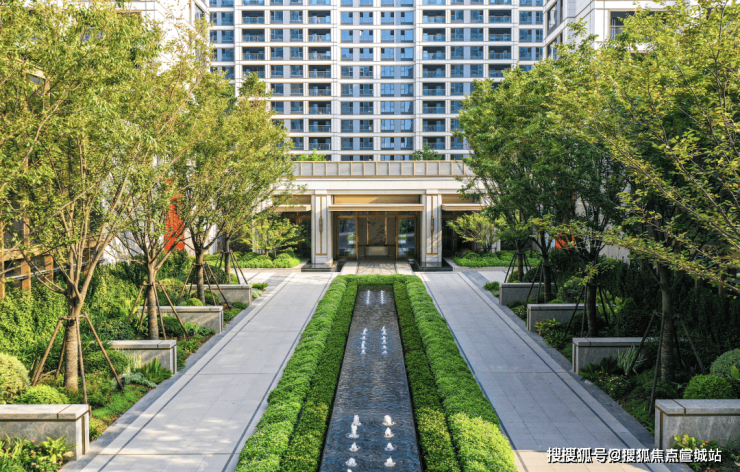 从项目南入口,穿越前厅的潺潺水景,便是与社区建筑完美融合的门厅大堂,其设计简约而不失精致,摒弃繁复细节,彰显出新海派独有的高雅格调。
