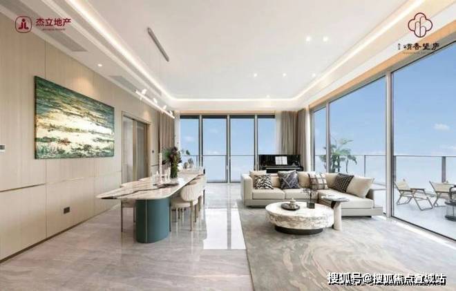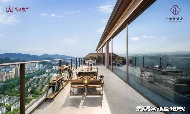 杭州杰立颂香望庐售楼处电话☎:400-885-1337(售楼处预约看房热线)最为极致的是上叠的餐客厅,双面落地玻璃围合,270°自然光如瀑布一般!并且,客厅与露台间还做了无门槛设计,让室内外的界限消弭于无。颂香望庐样板房实景-上叠餐客厅