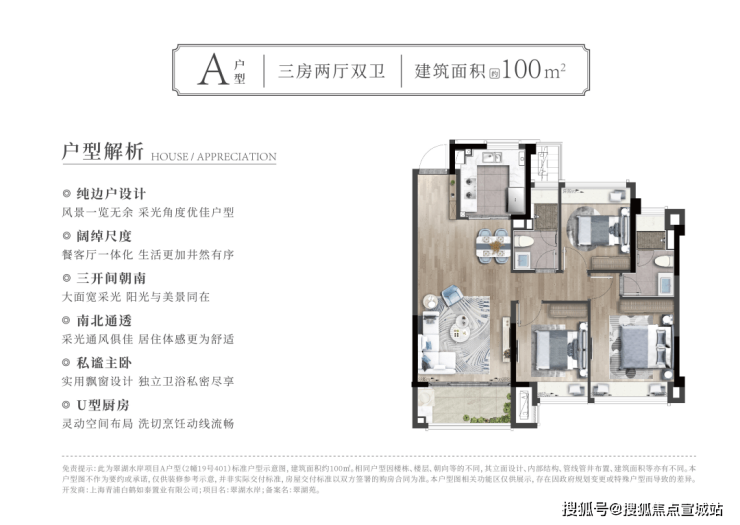 建筑面积约100㎡雅致三房两卫,满足二娃时代