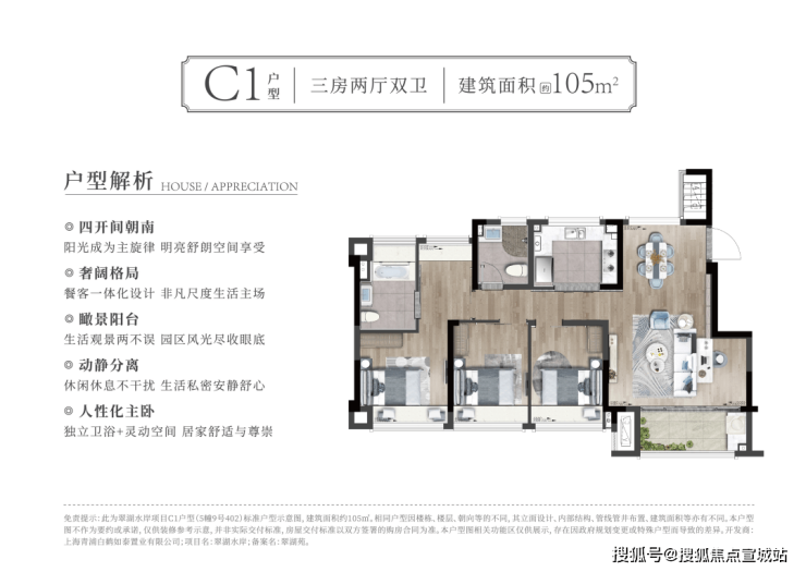 建筑面积约105㎡宽厅三房两卫,四开间朝南,舒适栖居理想