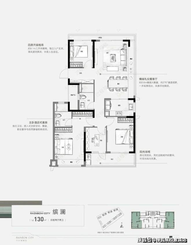 得房率:83%-88%,其中96㎡户型得房率88%,115㎡户型得房率85%,130㎡户型得房率83%。