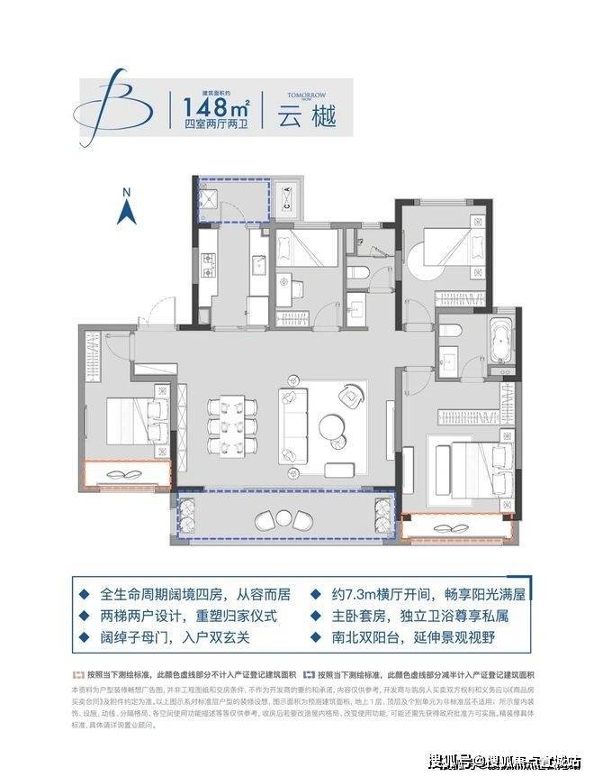 户型亮点:得房率高达79%,两梯两户配置,最大楼间距达72米,保障采光与私密性