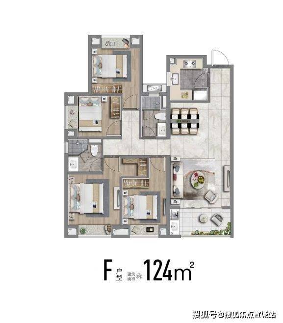 建面约124m²四房,市面常见的四房普遍要135平,这个约124平米户型功能性拉满,且控制了总价,给予更多小伙伴一步到位的机会。