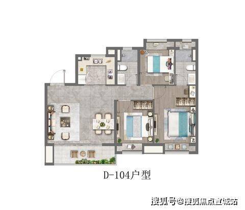 104㎡三房户型:四开间朝南,主卧套房设计,全卧室带飘窗,南北通透,超大的宽面阳台,做出了拥有 120㎡以上户型的尺度感和舒适度1214。