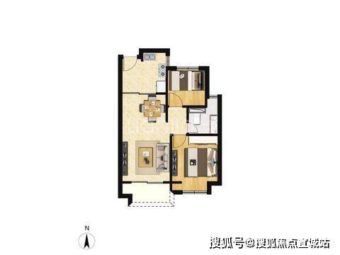 76㎡两房户型:户型方正,没有多余的走廊等空间浪费。客餐厨一体化设计,视野开阔,双开间朝南,保证了室内采光、通风良好1214。