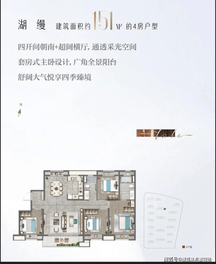 151㎡四房户型:四开间朝南,超大采光面,超宽横厅,可灵活布置家居摆设,满足不同家庭生命周期的需求。超阔入户门厅空间,增加了收纳空间;主卧全套房设计,自带衣帽间和独立卫浴,保护隐私的同时,避免了早晚卫浴使用高峰的拥挤与尴尬14。