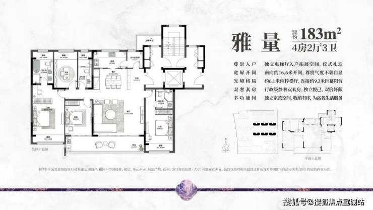主力户型:建面约 113㎡三室两厅两卫、143㎡四室两厅两卫、160㎡四室两厅三卫、183㎡四室两厅三卫