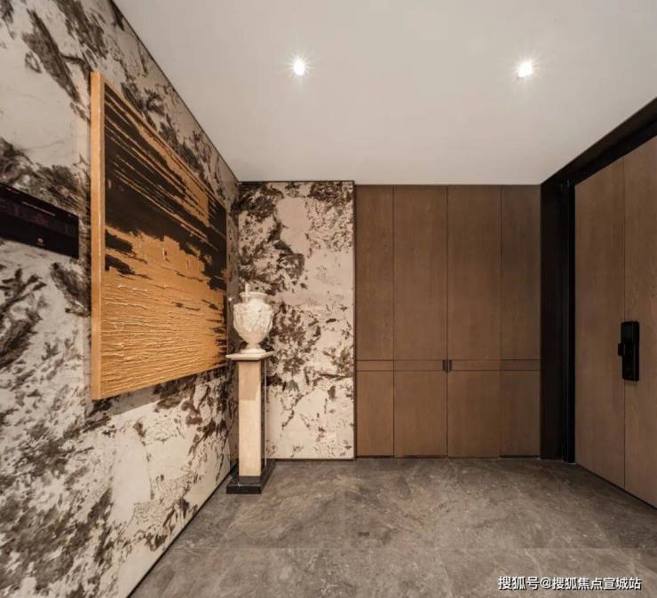 车马院以上海半岛酒店作为灵感来源,在设计方面采用了海鸥丽晶酒店同款的接待门,凸显出尊贵的大家门厅风范;营造社区归家的玄关,下挂式的星空顶、艺术雕塑、迎宾叠水以及范思哲黑背景墙相互映衬。