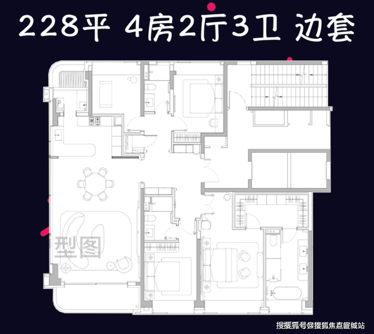 边套228平4房3卫,总价2677—3794万,空间感要强不少。