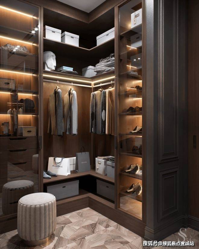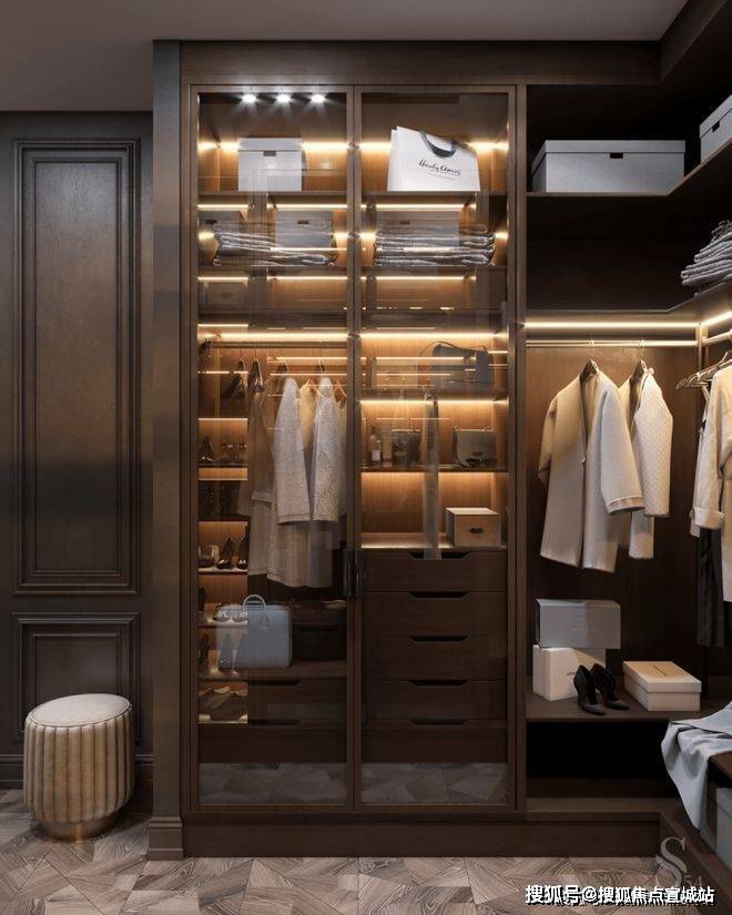 宽敞时尚的衣柜,这种衣柜由优质的木材制成,玻璃门和内置灯光,是非常实用且美观的。