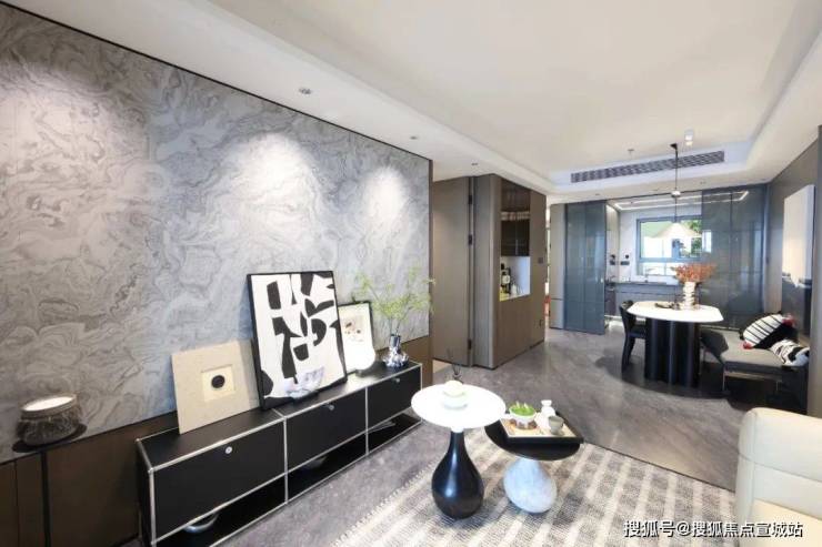 除了精装外,项目还有更多的品质感表现。例如客厅地 面选用的是北京城建国誉府高定的 温德姆灰大理石瓷砖 ;简一大尺寸瓷砖,拼缝仅0.35mm,工艺复杂,几乎无缝,整体性强
