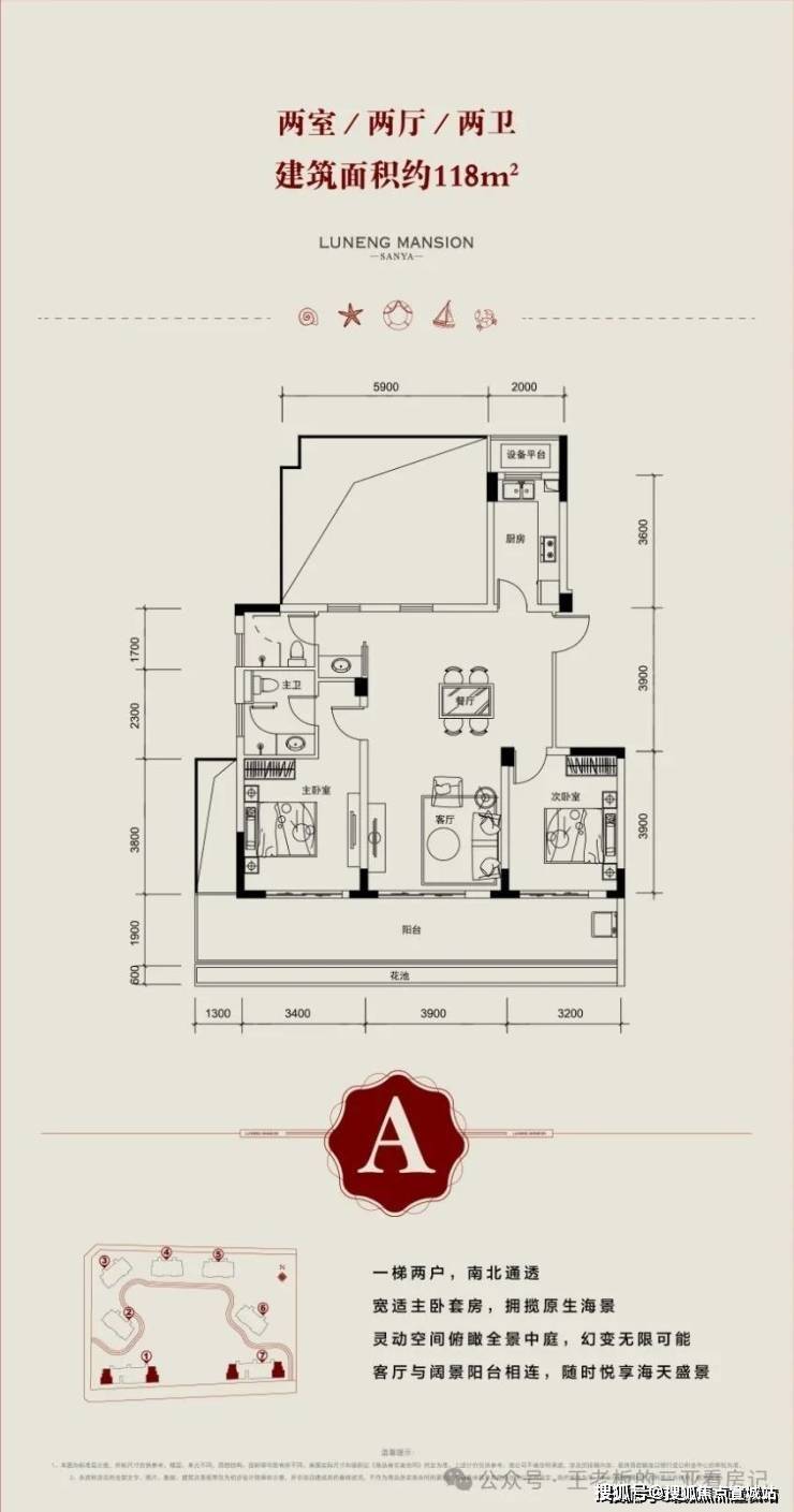 A户型:约118㎡2房2厅2卫(幻变4房),延展后可使用面积约155平米,南北双阳台