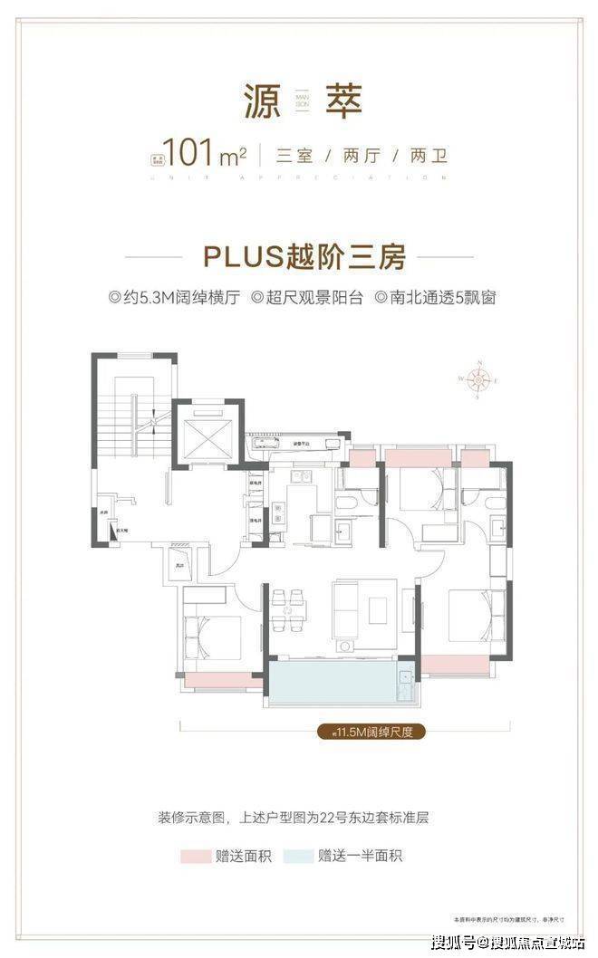 经典飞机户型+三开间朝南+餐客厨一体化+约5.3m的阔绰横厅,整体南向面宽达到约11.5m!整个户型的通透度和采光度很棒。