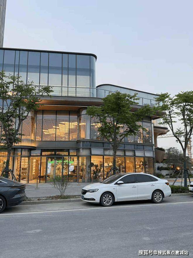 设计理念:自然融入生活:整体采用现代简约风格,搭配大面积落地玻璃,将室外的绿植景观引入室内,阳光透过玻璃洒在浅色调的接待区,既通透又显温馨;售楼处外还打造了约 800㎡的景观庭院,设有休闲座椅和四季绿植,到访客户可在庭院中漫步,提前感受社区的居住氛围。