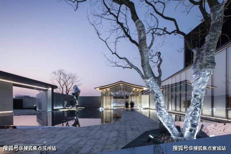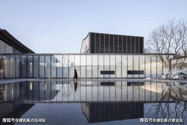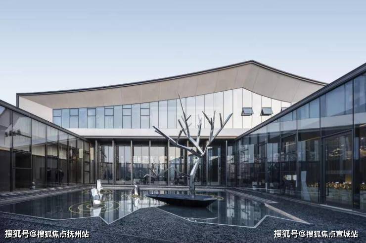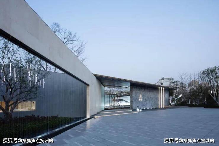 穿过大型玻璃构筑,走进前场。门楼前开阔的广场,昭示了元垄·华著“现代化、城市化”高端楼盘的定位。穿过西周直江上的景桥,即可看见景观水帘,水流淅淅沥沥地流淌,灵动悦耳,与简约的门楼相互映衬。踏上台阶,超大水面映入眼帘,水中倒映着简约现代、充满绍兴特色的销售中心建筑。