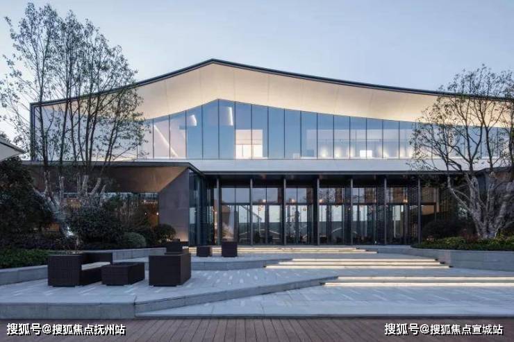 示范区后场面对水质良好的西周直江,设计团队打造了滨河景观带。沿建筑玻璃立面处设计的平台空间可用作室外洽谈区。景观设计采用现代市政手法,树阵广场结合草坪,局部种植花卉。人们于沿河外挑木平台上休憩,可观看沿河风光。草坪、花田、滨河景观打造出“花梗渔唱”之景。
