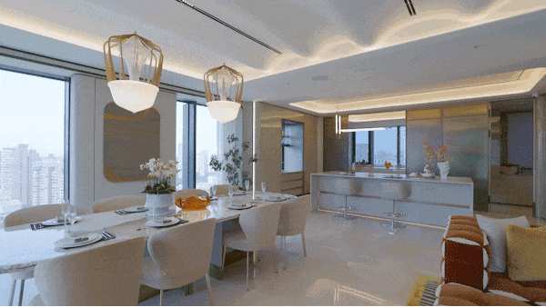 不同于市面上的短进深空间,这里足够举办小型Party,长条餐桌、迷你吧台、转角大沙发都能轻松容纳,可以承载多重摩登场景。