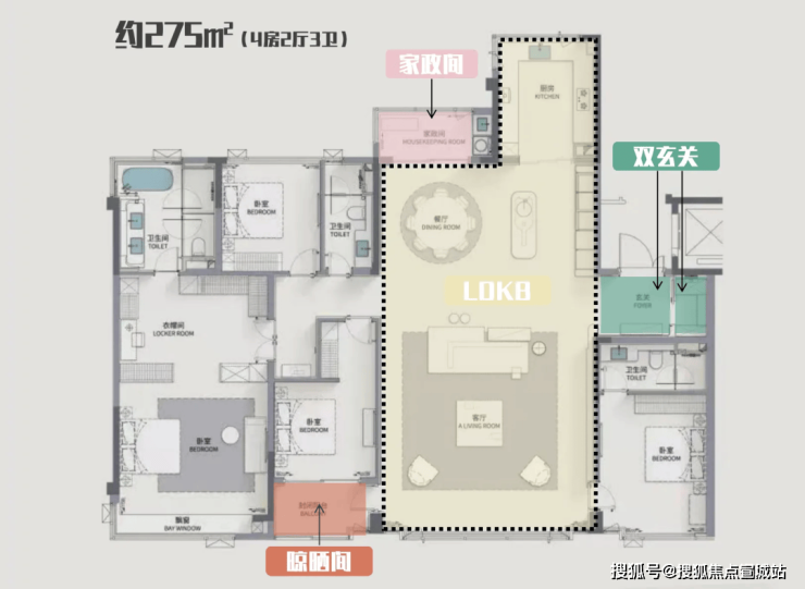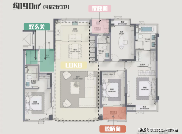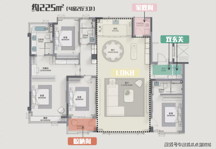 所有户型都做到双玄关+客厅阳台一体化+三间配置(阳台间、储藏间、家政间);