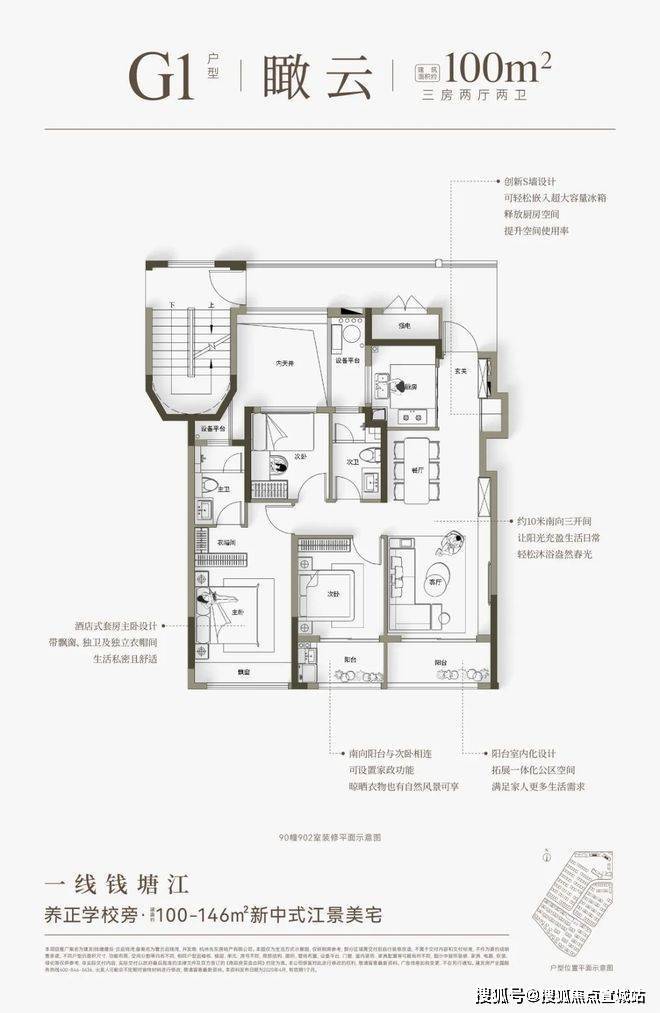 云启钱湾高层分为4种类型,建面约100㎡和建面约121㎡户型,做了创新S墙设计,提高了空间利用率,对年轻家庭来说,也是非常友好的.建面约146㎡四房户型,全部南向面江,大部分楼层还可看到一线江景.