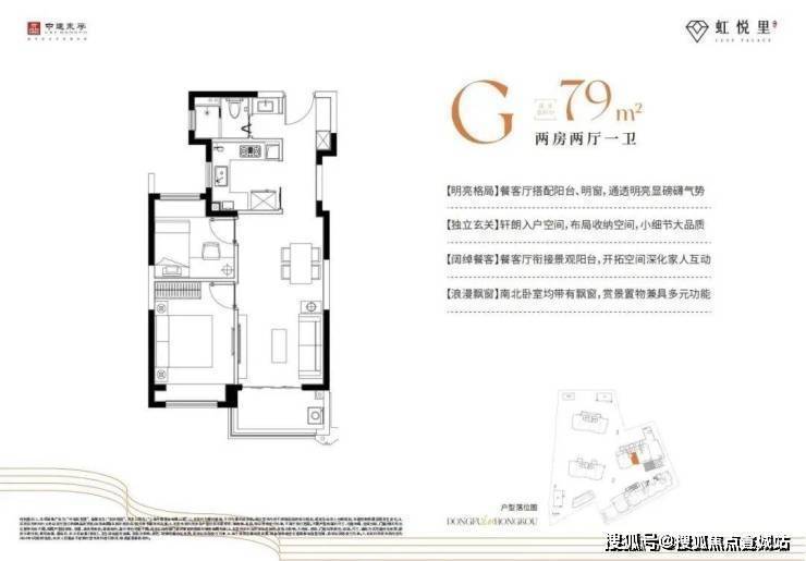 建面约79㎡2房G户型:该户型进门后配有玄关,让出入皆有生活仪式感,同时便于收纳随身物件。