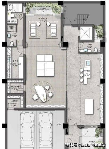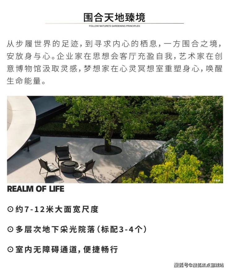 设计师以三面建筑和一面围墙,四合成内聚型的景观空间,庭院居于其中,成为建筑各房间的视线焦点.每户均有80至100平方米的开放式内庭院,宅在院中,宅院合一,天地共生,天人合一.每户地下层面均有3处花园式采光天井,保证了地下空间的舒适通透.