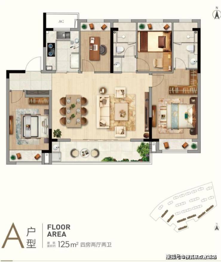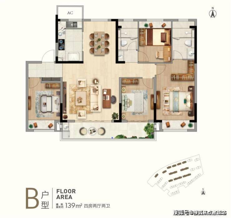 户型:125㎡(四房两厅两卫)、139㎡(横厅设计)、165㎡(非标三卫)