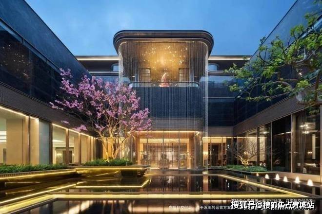 5、悬瀑垂幕水景,视听顶级双重享受下沉式环幕庭院,跌水景观环绕,池底仿黑金砂与宝石晶片闪烁,点缀百余灯珠,师法“琉璃水光”形意,糅合视听五感,打造全浸式立体园境,天工巧夺,嘉定未见。