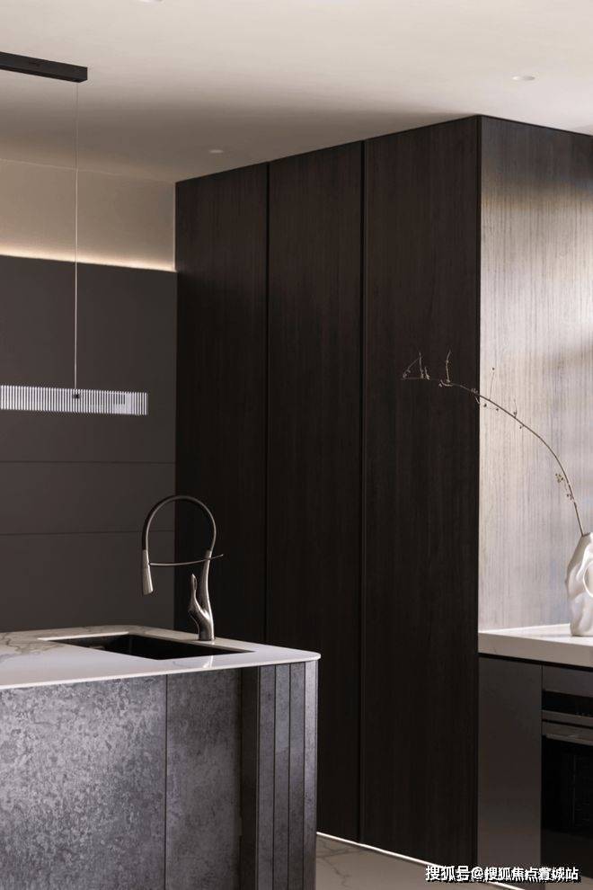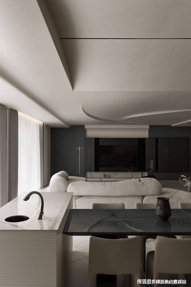 开放式布局,竖向的延展,拉伸了整个空间的尺度,体感上的通透给予生活更广阔的视野,当屋外的日光透过白纱,在纯净的氛围中糅入生活的气息,居者将更能感受饮食时光的美好温度。