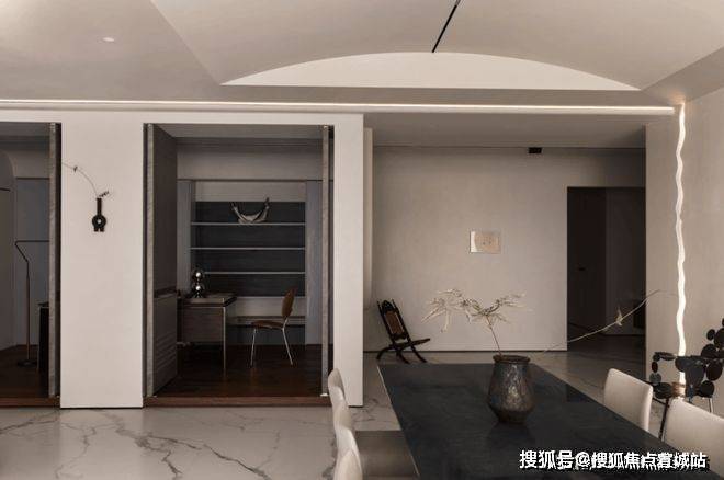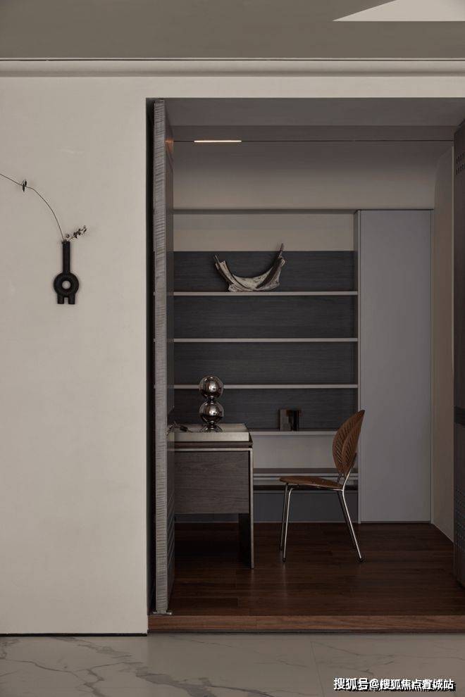 如果说餐厨是一家人的阳光与热闹,那么书房就是一个人的沉浸与关照。设计师借由光引导空间和情绪转折,通过隔断、错落等手法,演绎动与静,功能与艺术的平衡美。