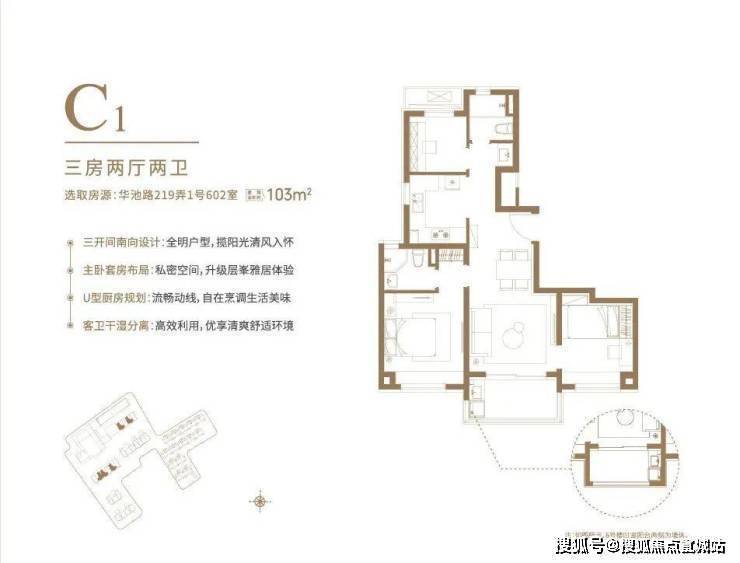 U型厨房的设计、干湿分离的卫浴、套房式的主卧等等。