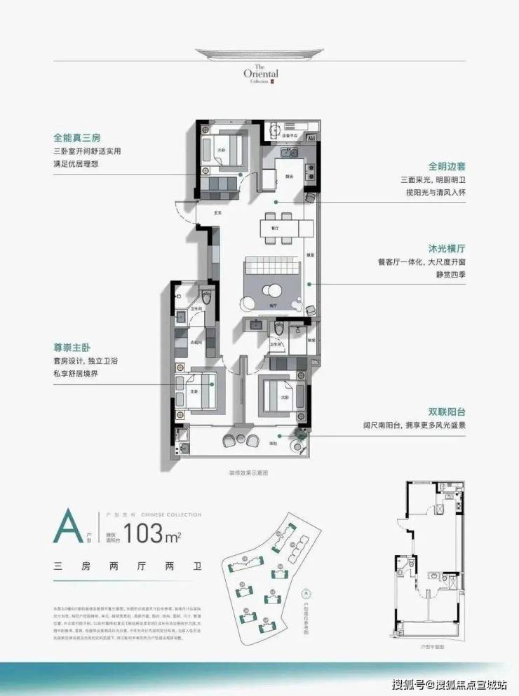 约103㎡边套户型,则是经典边厅格局。三面采光,两房朝南配双联阳台,约6.1米宽大边厅带飘窗,还有U型大厨房。