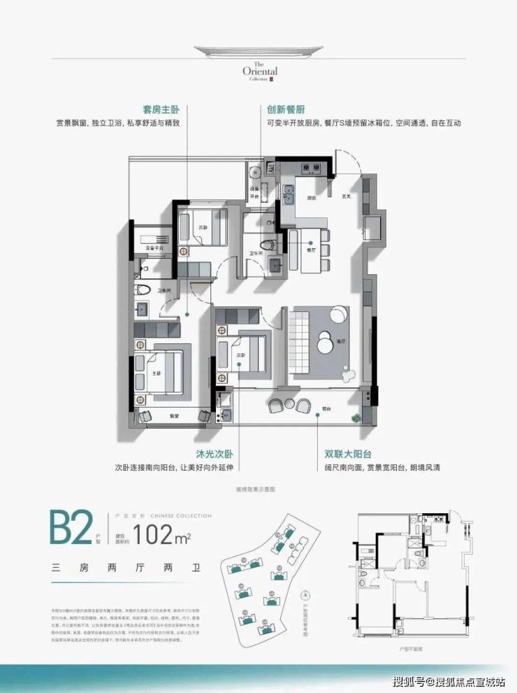 约102㎡中间套户型,三开间朝南布局,南向双联大阳台+主卧飘窗。