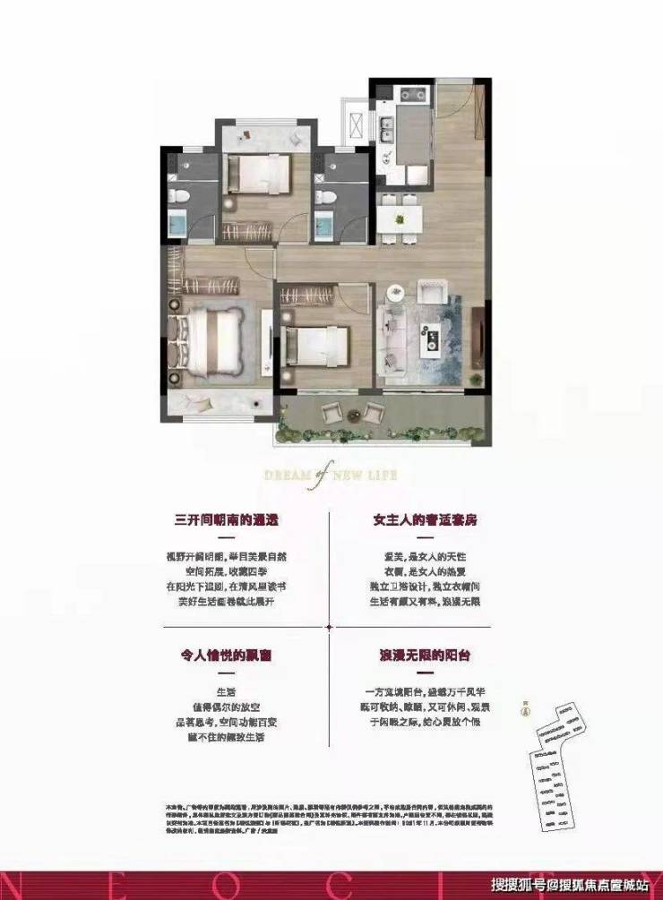 高层在售建面97平方3房2厅2卫,2梯4户设计,得房率约82%!(高层得房率通常为75%左右)。