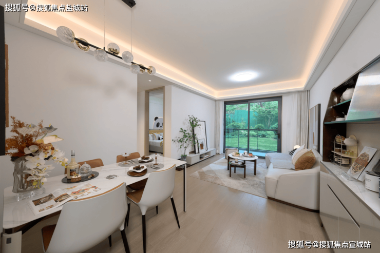 3.5开间的南向户型,除了主次卧朝南,更进一步将客厅的开间加宽,成为一个横厅。横向宽厅的好处是可以有更多的南向采光,阳光更充足。此外,客厅可以弹性软分隔的方式,分出一个开放式书桌的空间,适配更长的家庭周期。