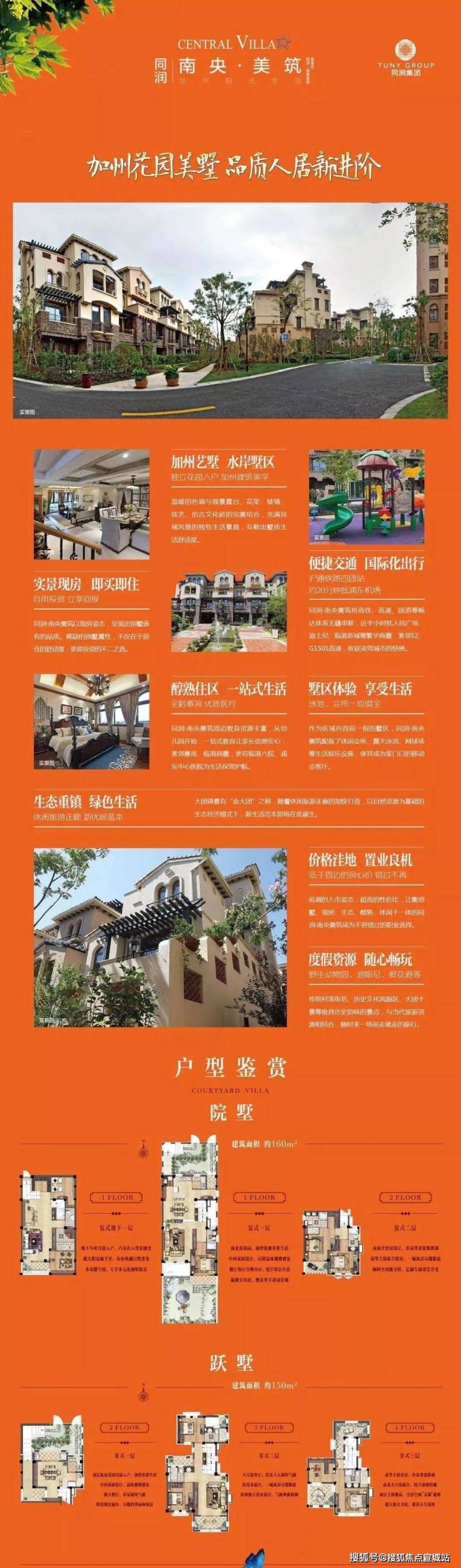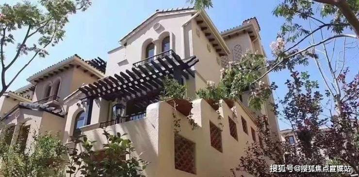 【同润•蓝美俊庭】采用南加州的建筑风格,外立面采用文化石和暖黄色涂料,搭配红色的筒瓦、烟囱、铁艺栏杆等建筑,尽现南加州原乡风情。