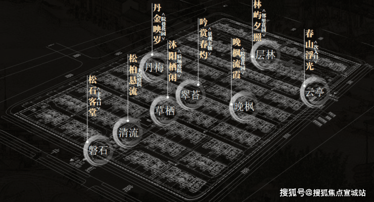 8大景观节点:营造可行、可观、可游、可居的东方诗意天地。①松石客堂-主入口;②松桕悬流-下沉庭院;③沐阳栖闲-后场庭院;④吟赏春灼-景观主轴;⑤丹金映岁-院巷花园;⑥晚枫流霞-院巷花园;⑦林屿夕照-邻里花园;⑧春山浮光-次入口