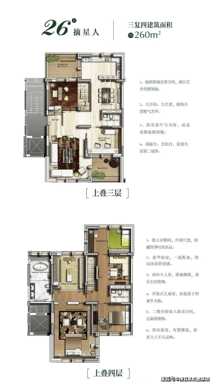 建面约 260-280㎡大平层(8-12F):精装交付,总价 2740-2980 万,采用大金、林内等一线奢装品牌,配置中央空调、全屋地暖等健康系统及智能入户等精工产品。