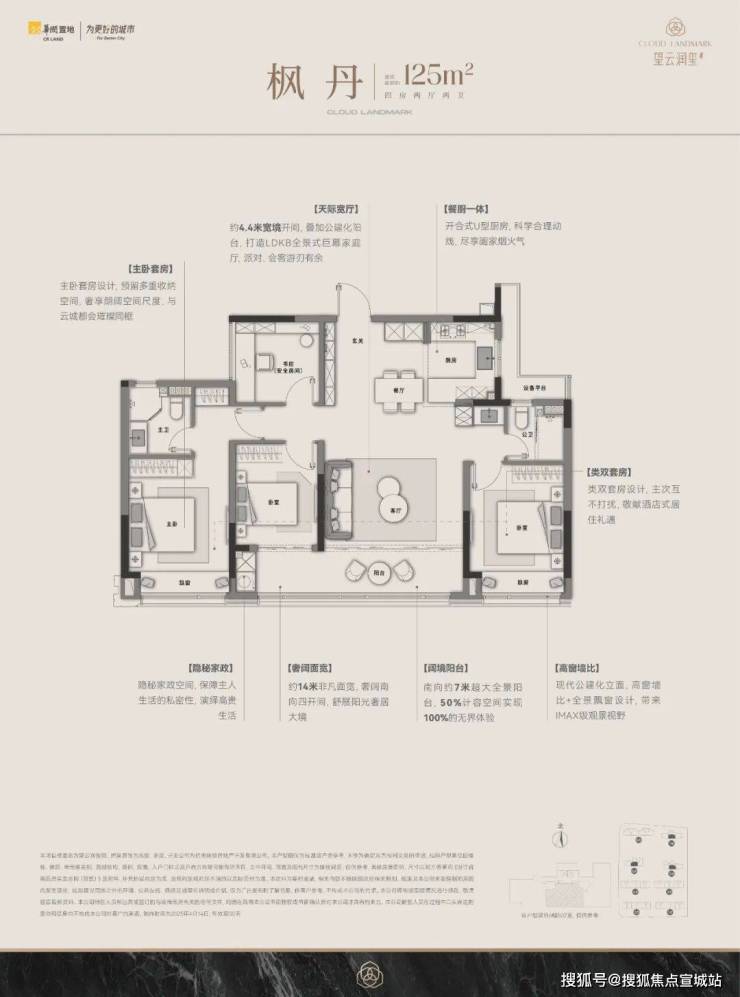 建面约125㎡四房户型也很好,餐厅、客厅、阳台,乃至玄关,都被纳入一体化设计,开间尺度喜人。