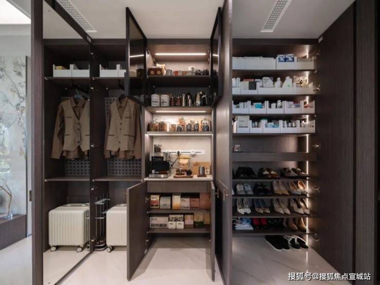 细节方面同样不遑多让,厨房间采用大师级高定隐藏移门,收放自如,多见于高星级酒店;空调进风口一改过往的平淡,采用专属山茶花镂花造型;卧室全部采用精工考究的拼花地板;出行回来行李箱的收纳位,以及扫地机器人的归位,也都预留好。