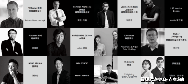 包括外滩华尔道夫酒店的缔造者波特曼建筑设计事务所、来自中国香港的先锋设计机构10Design和Platform,参与设计上海新天地的日清建筑设计,擅长室内空间设计的LSDInteriorDesign、水平线、Linehouse、NONGSTUDIO以及设计外滩建筑群灯光照明的TSlighting等。