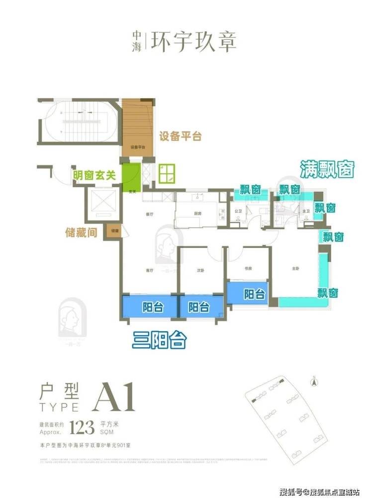 以建面约123㎡3房为例,南向4开间,3阳台+6飘窗+1设备平台。