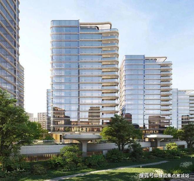 建筑创新:整体抬高3米打造“空中花园”,采用蓝灰色玻璃幕墙与弧形阳台设计,采光优越,地下设环岛通道,首层5米挑高会所。